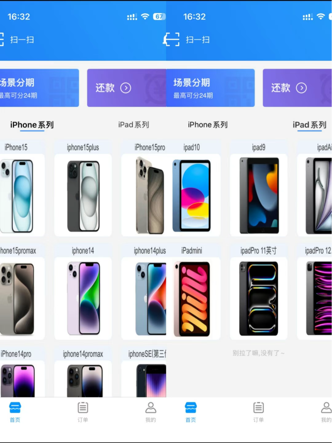 “即分期超G会员”的页面较为简单,仅有分期产品及还款的入口,接着便是不同型号的iPhone与iPad等商品展示。