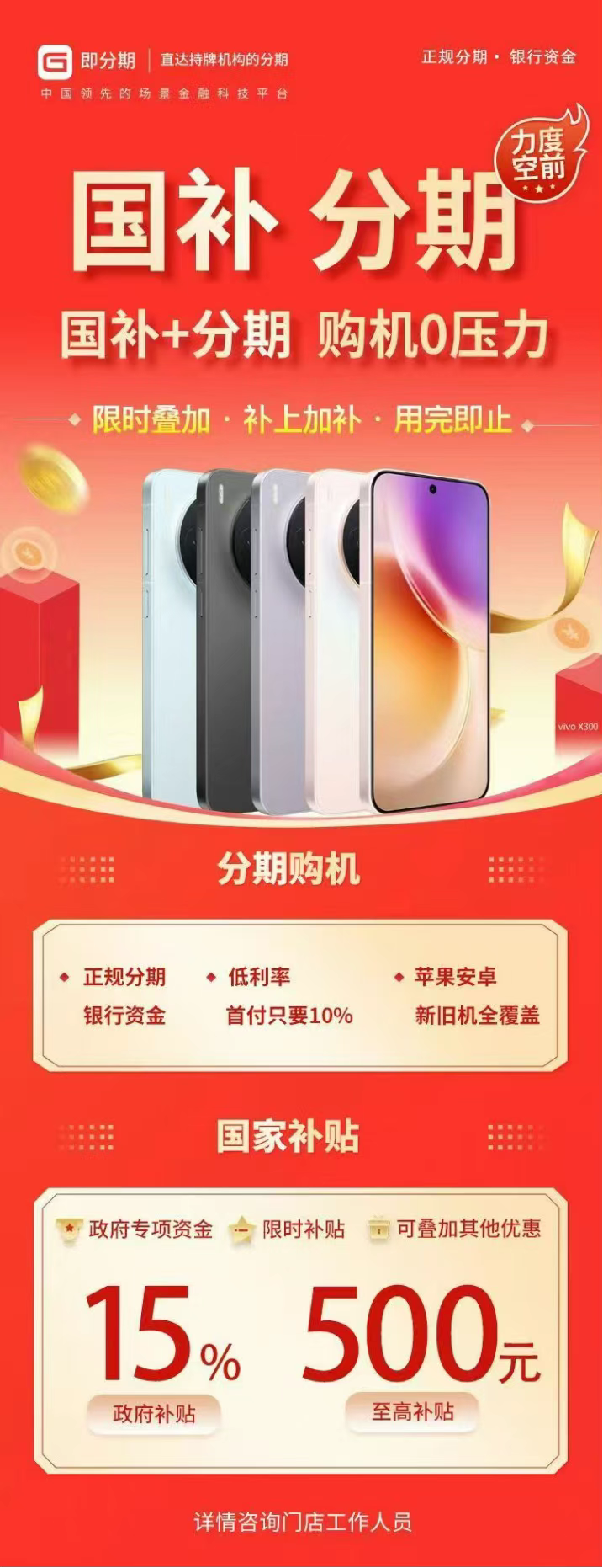 值得一提的是,据业内人士称,近日,即分期正进行“国补+分期”的活动,海报称,首付只需10%,就能购机,覆盖范围包括苹果、安卓。
