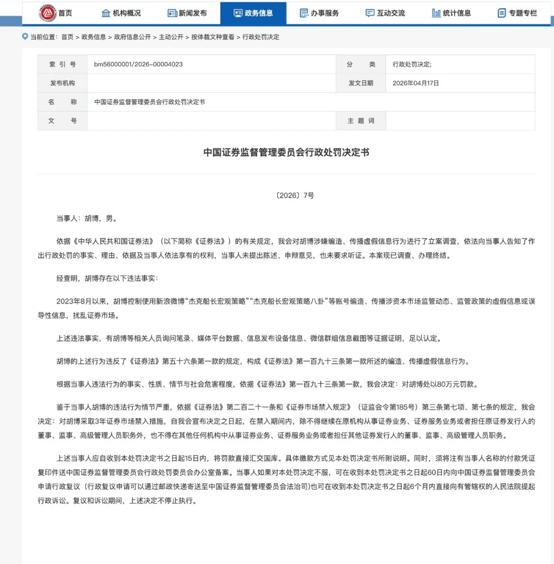 4月17日,中国证券监督管理委员会公布行政处罚决定书,经查明,胡博存在以下违法事实:2023年8月以来,胡博控制使用新浪微博“杰克船长宏观策略”“杰克船长宏观策略八卦”等账号编造、传播涉资本市场监管动态、监管政策的虚假信息或误导性信息,扰乱证券市场。证监会决定:对胡博处以80万元罚款。对胡博采取3年证券市场禁入措施。