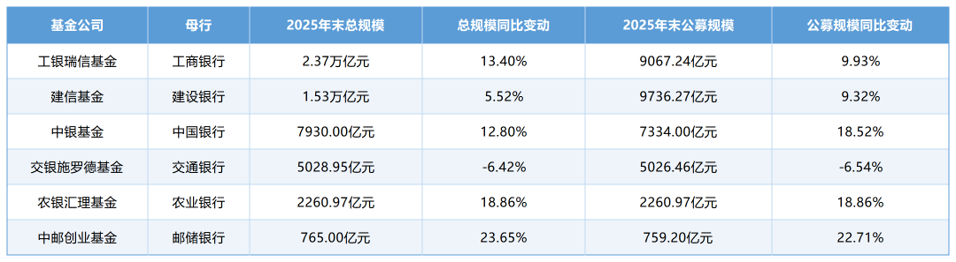 基金管理规模向来是资管机构实力的直观体现,对于银行系基金而言,这一指标更与母公司渠道资源的禀赋息息相关。