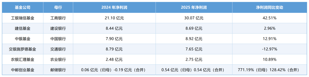 农银汇理基金和中邮基金的盈利规模相对较小,靠近尾部。其中,农银汇理基金2025年实现净利润2.75亿元,同比增长10.89%,结束了此前净利润连续下滑的态势;中邮创业基金实现盈利大幅增长,2025年净利润达5140.23万元,同比增长758.50%,主要得益于去年同期较小盈利规模基准,增速惊人。