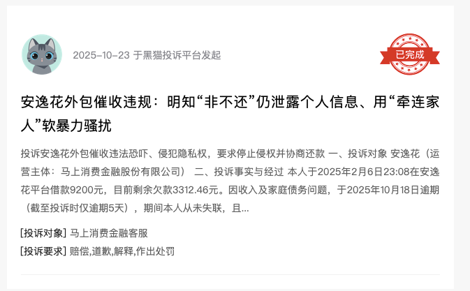 诸多用户投诉案例,直观展现了其业务乱象:2025年10月,有用户在“安逸花”借款9200元,剩余欠款3312.46元,因收入问题逾期5天,期间多次主动表达还款意愿并申请协商,但马上消金委托的催收人员,不仅拒绝协商、强制要求全额还款,还以“上门拍摄、引发围观”相威胁,强制索要用户近3个月银行卡流水、身份证复印件等敏感信息,甚至以损害名誉相施压,严重侵犯用户隐私权与合法权益,该用户已留存通话录音并向监管部门投诉。