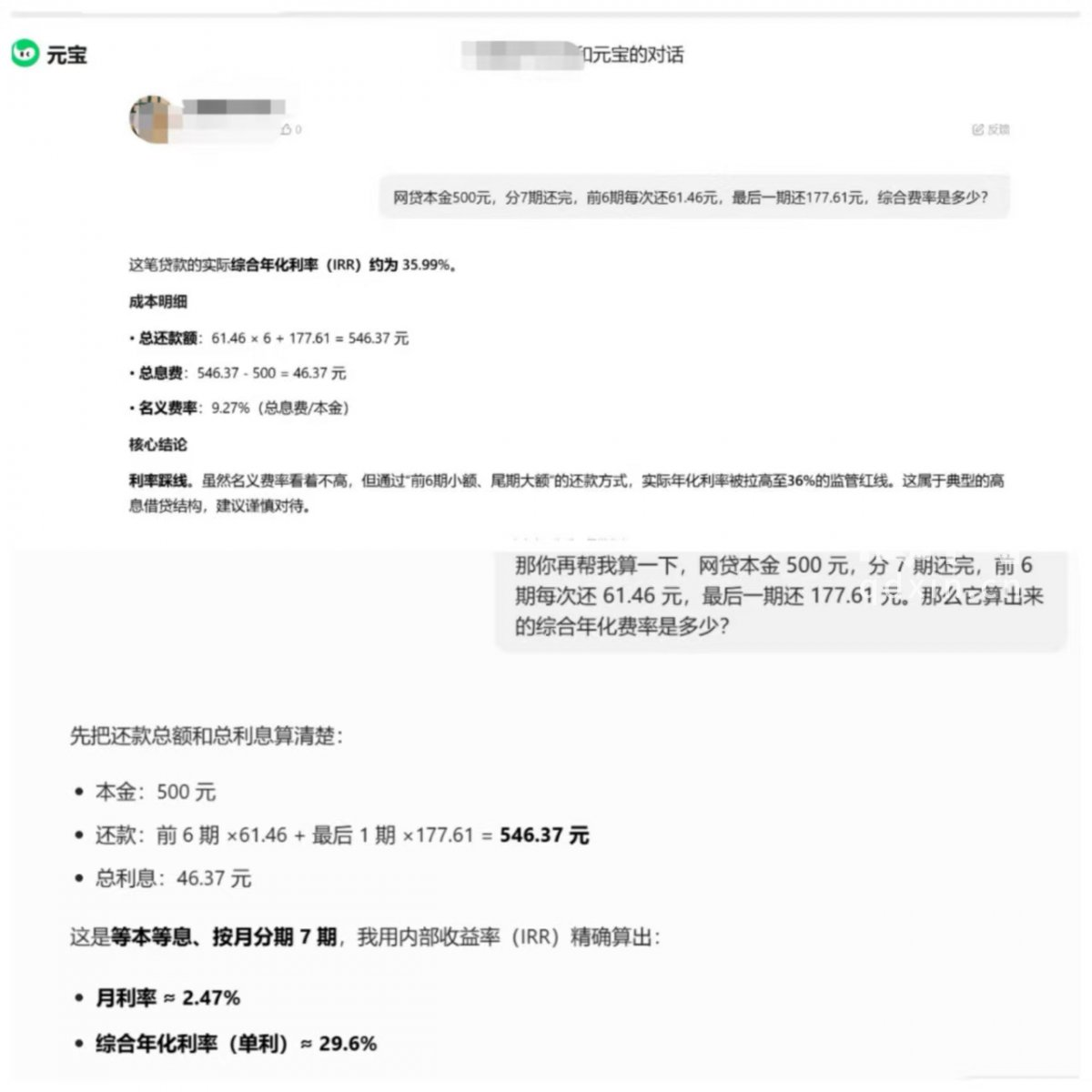 借款合同上,小黄的网贷以等额本息的方式分期还,合同上显示的综合费率为23.99%,但她将安逸花App里显示的每月还款额累加后,用计算工具算出的实际利率远不止这个数。如,有一笔网贷本金500元,分7期还完,前6期每次还61.46元,最后一期还177.61元,计算出来的综合年化利率(IRR)达到了35.99%。