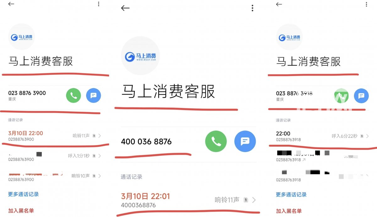 史先生在马上消费金融借的网贷逾期了,3月10日22时整,史先生的手机响起,是一个023开头尾号3900的号码打来的,手机识别该号码为“马上消费客服”。没等史先生接听,这通电话就挂断了。22时01分,一个400开头但同样显示为“马上消费客服”的电话打了进来,“电话我没接,响铃11声之后就挂断了。”3月11日22时,一个023开头尾号为3918、被手机识别为“马上消费客服”的电话打了进来。这一次,史先生接起了电话,跟对方进行了6分多钟的通话。