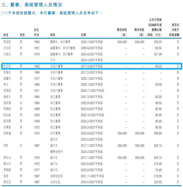 资料显示,史玉柱1962年9月出生,巨人网络创始人、董事长,也是中国资本市场极具传奇色彩的民营企业家。其与民生银行的渊源可追溯至2006年,首次出任该行非执行董事;2014年曾短暂辞职,2016年底回归董事会,2020年8月、2024年6月两度连任,现任民生银行第九届董事会非执行董事。史先生现任巨人网络集团股份有限公司(原“重庆新世纪游轮股份有限公司”)董事长、上海巨人网络科技有限公司(原“上海征途网络科技有限公司”)董事长、巨人慈善基金会理 事长、上海巨人投资集团有限公司执行董事。曾任上海征途网络科技有限公司董事。史先生于1984年获得浙江大学数学学士学位,1990年毕业于深圳大学软件科学系研究生班。
