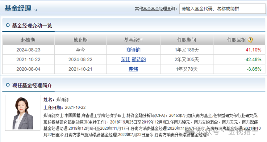郑诗韵的履历本是亮点:麻省理工经济学硕士、CFA持证,2015年入南方基金,从研究员升至副总,尤其精于消费研究。但这份“金字招牌”未能化作业绩。