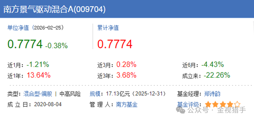 Fintecdaily.com认为,南方景气驱动混合A(009704)这只昔日“百亿级”产品,由南方基金高管茅炜倾力打造,却在高管更迭后陷入业绩泥潭。截至2026年3月初,基金最新单位净值约0.7953元,成立以来累计回报率仍徘徊在-20%左右,首募投资者持有至今亏损超五分之一。规模从93.73亿元暴跌至17.13亿元,缩水逾80%,净赎回潮反映基民信心崩塌——基金吧中,不乏持仓2000多天、亏损34.84%的“铁粉”吐槽。茅炜管理期(2020-2021)回报仅-3.85%,卸任后郑诗韵接盘,独立掌舵两年多累亏42.48%。虽2024年后反弹41.10%,但整体跑输沪深300:近1年回报13.64% vs. 大盘18.2%,近3年3.68% vs. 12.5%。郑诗韵的“赛道押注”风格高度集中,前十大重仓股占比55.22%,如腾讯、宁德时代等消费与新能源标的,在风口时放大收益,却在景气周期切换中放大回撤——最大回撤达58.11%,远高于同类平均。