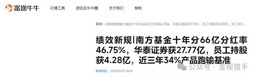此外,富途牛牛信息显示,南方基金过去十年的分红较大。据华泰证券年报数据推算,2015至2024年,南方基金累计净利润141.16亿元,向股东分红65.99亿元,分红比例高达46.75%。作为持股41.16%的第一大股东,华泰证券十年豪取27.77亿元,占南方基金同期净利润近20%。