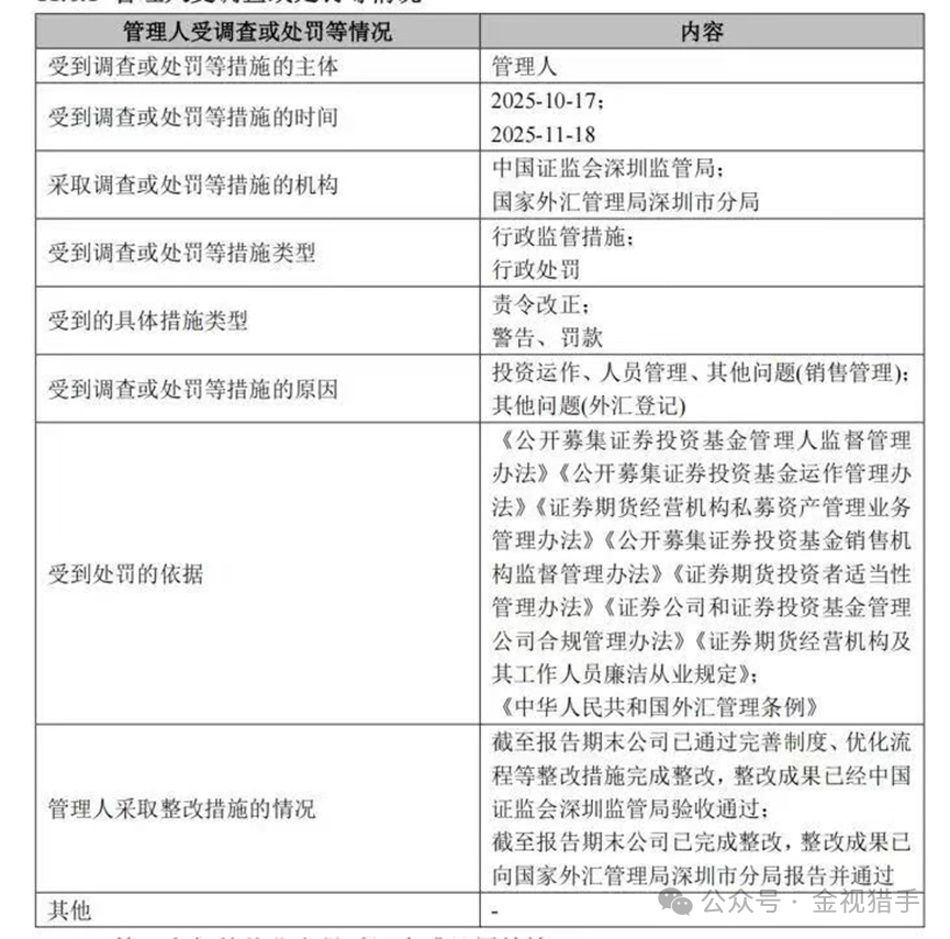 但盈利能力强劲,并不代表内控治理到位。就在 2025 年,南方基金接连遭遇监管 “敲打”,先后被两大监管机构处罚。2025年10月和11月,深圳证监局、国家外汇管理局深圳市分局先后对其投资运作、人员管理、销售管理及外汇登记等问题开出罚单,公司高级管理人员也被出具警示函。