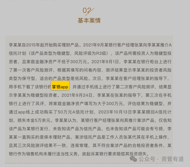 本案事发于2021 年 9 月,涉案投资者为老年群体,自身风险承受能力较低,无高风险产品投资意愿,原本仅计划配置低风险稳健理财,全部业务均在农行线下网点及掌银 APP 办理。