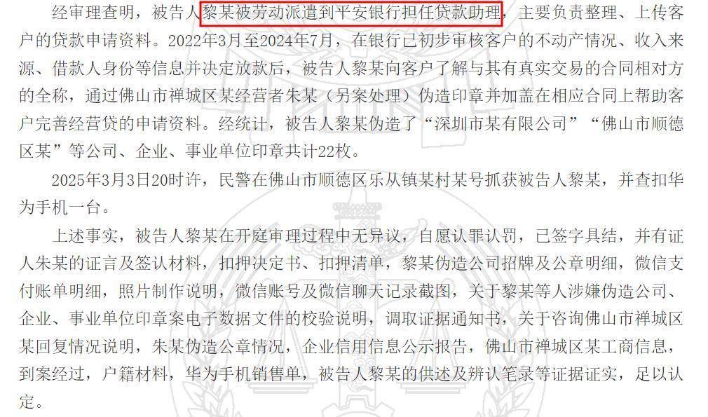 经法院审理查明,2022年3月至2024年7月期间,被告人黎某利用其在平安银行担任贷款助理、负责整理上传客户贷款申请资料的职务便利,在银行已初步审核客户不动产情况、收入来源等信息并决定放款后,为帮助客户完善经营贷申请资料,通过佛山市禅城区某印章经营者朱某(另案处理),伪造了“深圳市某有限公司”“佛山市顺德区某”等公司、企业、事业单位印章共计22枚。黎某将伪造的印章加盖在相应合同上,用于银行贷款申请流程。