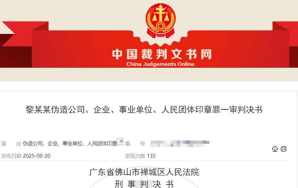2025年8月7日,佛山市禅城区人民法院作出一审判决:被告人黎某犯伪造公司、企业、事业单位印章罪,判处有期徒刑六个月,并处罚金人民币3000元。刑期自2025年3月3日起至2025年9月2日止。
