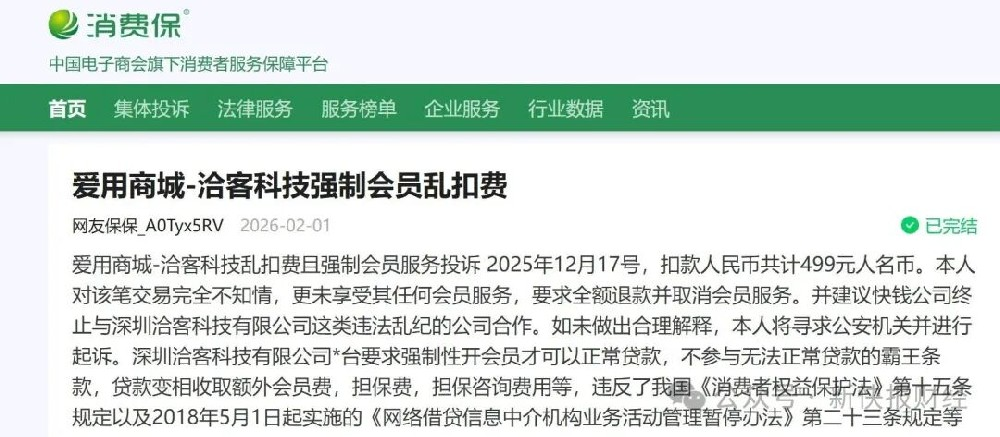 在第三方投诉平台上,有消费者表示,洽客科技旗下的爱用商城存在强制会员服务,只有开会员才可以申请贷款,然而在自己未享受会员服务的情况下,被平台划扣了会员费。对此,消费者认为爱用商城存在霸王条款行为,贷款服务变相收取额外会员费。