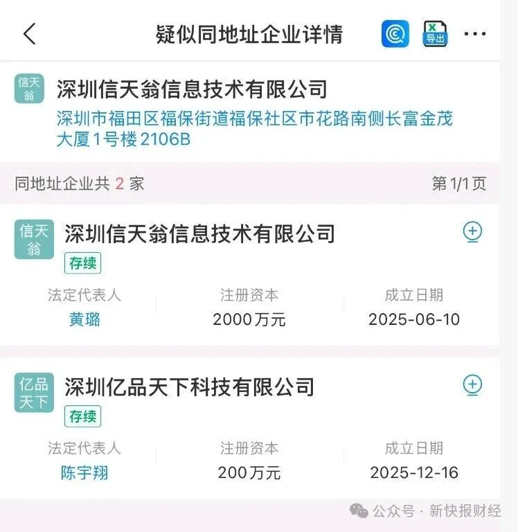 企查查显示,深圳市凯利盈达信息科技服务有限公司现已更名为广州市凯利盈达信息科技服务有限公司,由深圳信天翁信息技术有限公司全资控股,而深圳信天翁信息技术有限公司的注册地址与洽客商城关联企业深圳亿品天下科技有限公司注册地址一致。