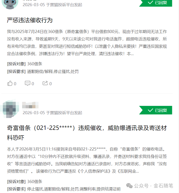 在黑猫投诉平台,奇富借条(原360借条)有近5万条投诉,近1个月投诉量也有586条。根据用户投诉内容,主要集中在奇富借条暴力催收、高息借款、涉嫌高利贷等违规乱象有关。