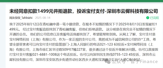 此外,还有用户被扣款899元、1240元,最高一笔扣款达1499元。2025年8月,有用户在消费保平台投诉,称其在不知情的情况下被扣款1499元,经支付渠道宝付客服追溯确认扣款方为青松融,但平台拒绝退款。