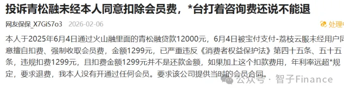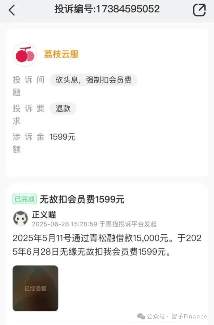 根据用户投诉信息,青松融的会员费并非由其运营主体深圳青松云数字科技有限公司(下称“青松数科”)直接收取,而是通过荔枝云服代扣,这一模式的核心目的的是规避助贷新规中“平台运营机构不得以任何形式向借款人收取息费”的明确要求。