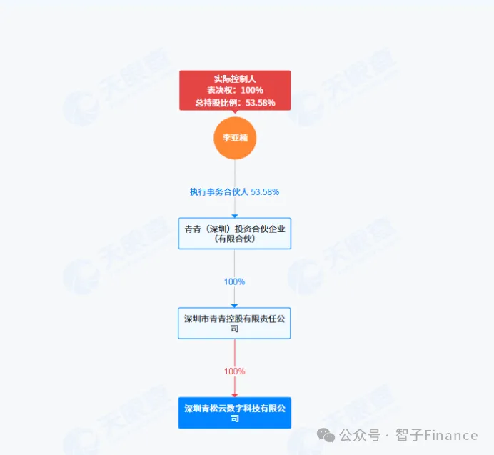 股权结构显示,青松数科由深圳市青青控股有限责任公司(下称“青青控股”)100%控股,而青青控股又由青青(深圳)投资合伙企业(有限合伙)(下称“青青投资”)100%控股,层层穿透后,青松数科的实际控制人为李亚楠。