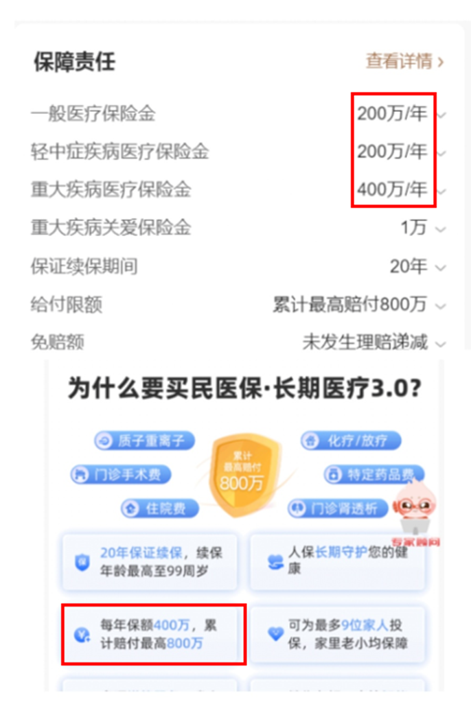 “民医保·长期医疗3.0”的一般医疗保险金保额为200万元,而重大疾病医疗保险金则设定为400万元。在人保寿险E服务的销售详情页中,平台仅以醒目字号标注“每年保额400万”,并未对200万的一般医疗限额进行等权展示。消费者在快速浏览时,极易产生该产品全项责任均覆盖400万保额的通感。
