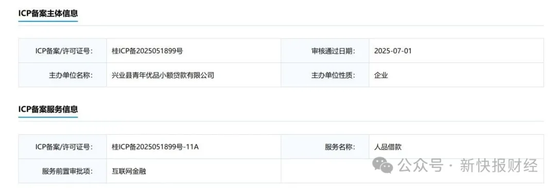 据新快报财经了解,人品科技此前已通过股东连带转让形式收购兴业县青年优品小额贷款有限公司,该小贷牌照属于地方小贷牌照,主要用于人品科技旗下贷超产品上架。公开信息显示,兴业县青年优品小额贷款有限公司涉及的App备案信息中,已有人品借款、好会借等人品科技旗下贷款产品。