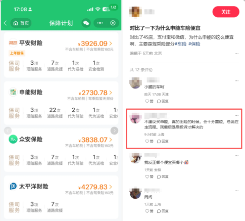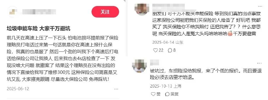 类似的分享还有很多,“车损险没给我报,来了个低的报价”“理赔员没有出险的情况下直接写了300元维修费”“真的出事故后这家保险公司把我们买保险的人告了”……