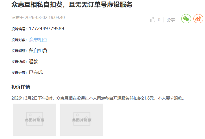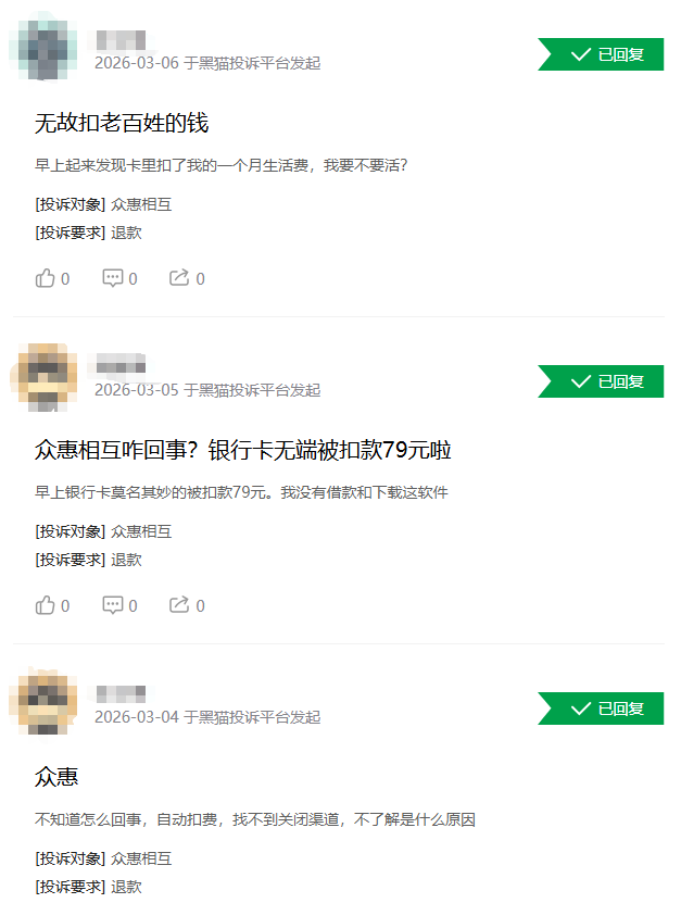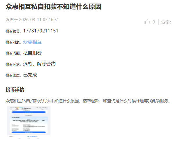 黑猫投诉平台显示,截至2026年3月,与众惠财险相关的投诉超3500条,与水滴保相关的投诉已达2846条。常见投诉聚焦于无通知、不知情就被投保、被扣款、查不到保单等情形,要求保险公司退款、解约。