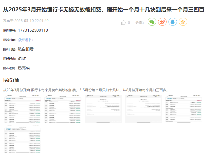 啄木鸟投诉平台也有用户投诉,称从未购买过众惠财险的保险,却被不知情扣款,且查不到保险内容,要求退款退订。