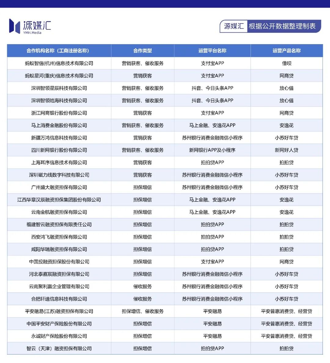 近日,苏州银行公示了“互联网贷款业务合作机构名单”,合作的网贷产品包括借呗、放心借、网商贷、小苏好车贷、新网好人贷、平安普惠等,同时还公示了合作的担保公司、催收公司。