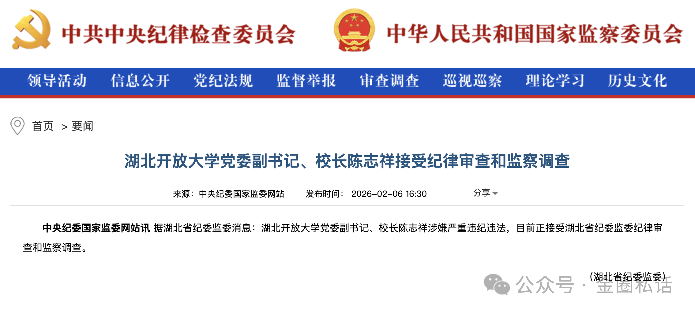 日前,湖北省纪委监委通报,湖北开放大学党委副书记、校长陈志祥涉嫌严重违纪违法,正接受纪律审查和监察调查。
