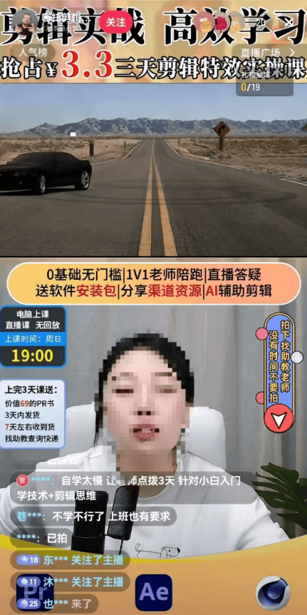 在短视频上搜索直播剪辑课会出来不少教学切片和直播间,《新民周刊》记者随机点进一间标注“零基础入门影视后期”“3.3元三天剪辑特效实操课”的直播间,主播正在卖力介绍,她表示这门课程0基础无门槛,老师1v1陪跑,3天试听课结束后还赠送软件安装包和价值69.8元的教科书。“光靠自学摸索要到什么时候?每个人都不差这3块3,给自己一个机会!”主播如是催单。