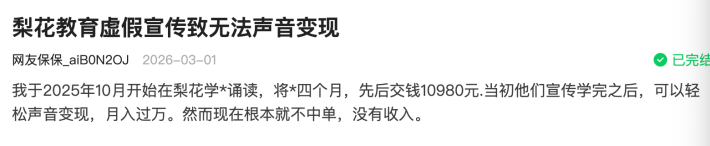 梨花教育是十方融海旗下聚焦有声书配音培训的垂直职业教育品牌,主要面向45岁-65岁的“新中老年群体”。在另一投诉平台黑猫投诉上,十方融海梨花教育的相关投诉也高达5000余条,虚假宣传、无法变现等都是高频词,而受害群体多为中老年人。