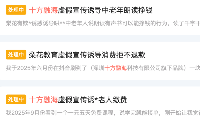 值得一提的是,梨花教育与十方融海曾收获众多行业认可。然而,如今企业面临的海量投诉与退款诉求,也昭示着其在经营合规方面存在的问题。尤其是以“月入过万、包接单”为噱头的虚假宣传,精心设计的推销手段诱导消费等,针对信息辨别能力较弱的老年群体,令其透支信用卡、借贷购买高价课程与设备,无疑违背商业诚信,更违反了《消费者权益保护法》。