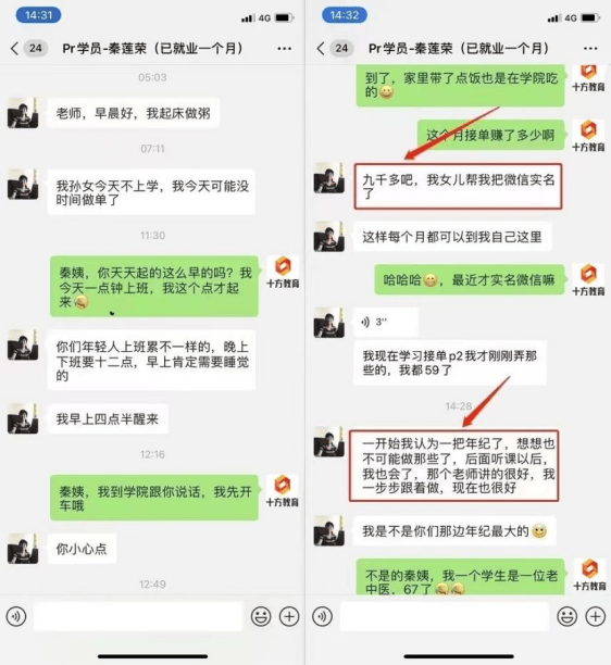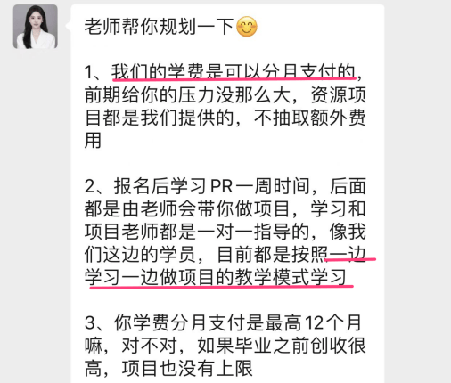 与此同时,记者的“专属老师”也在微信上对记者“催单”,为了让记者下定决心,他不仅为记者申请了勤工俭学价格,从7980元直接降到4000元,还表示可以分期支付减小压力;另外,他还给记者发来了过去学员转型成功的案例,表示可以边接单边上课,“Pr剪辑20天学完,接单单价一般在50到300元,AE、C4D特效学完正常要两个月,到时候就可以接500到5000元的单子”。