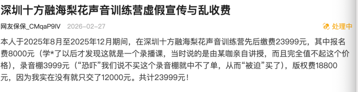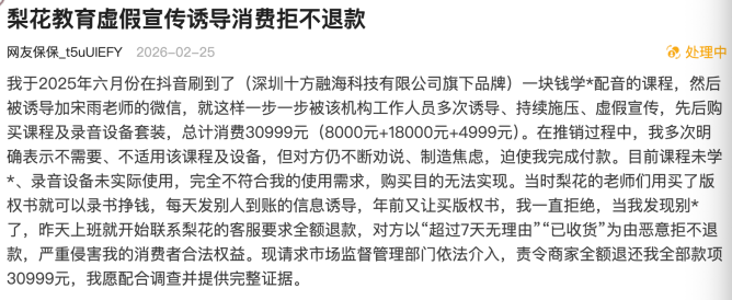 其中一名消费者表示,自己在平台上看到一块钱学配音的课程,然后被诱导添加老师的微信,在工作人员多次诱导、持续施压、虚假宣传下,先后购买课程及录音设备套装,总计消费30999元(8000元+18000元+4999元)。