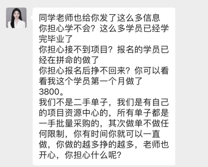 当记者因为费用关系百般纠结时,“专属老师”还表示接了一个C4D的商业订单过来给记者练手,当记者表示对C4D完全不熟悉时,“专属老师”也表示没有关系。“专属老师”还表示可以分阶段收取学费,先交2000元就可以开课了,并表示名额紧张,欲购从速.......