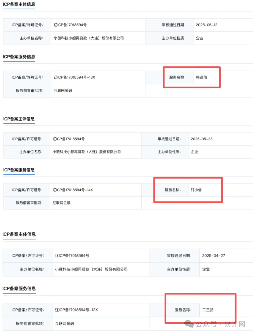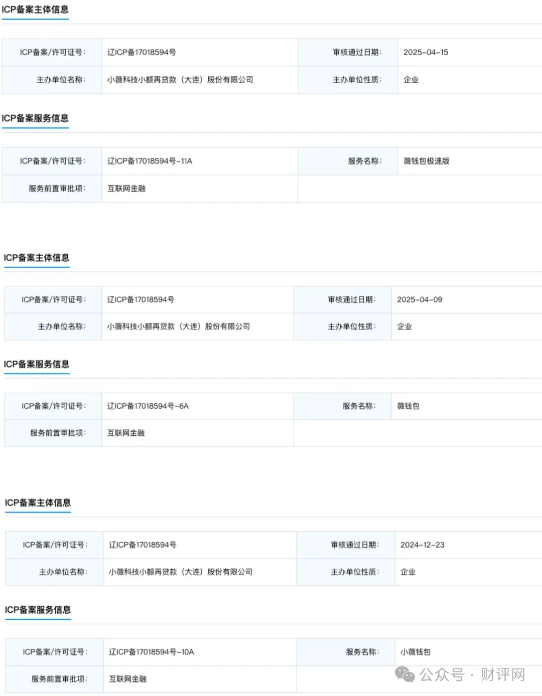 这些APP就像同一个工厂生产的不同包装产品,图标设计、页面布局高度同质化,核心功能都是贷款导流。它们对外统一标注“运营主体为小薇科技小额再贷款(大连)股份有限公司”,借此持牌小贷资质在应用商店备案上架。