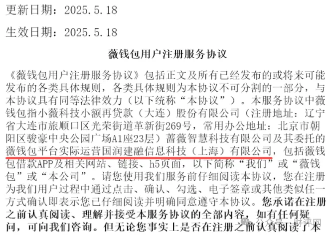 但深入探查就会发现,所有这些马甲包的用户服务协议和隐私政策,都指向同一家实际运营方,国润建融信息科技(上海)有限公司。这家公司自身并未取得任何金融放贷或金融信息服务相关资质,其经营范围仅包含互联网信息服务和软件开发。