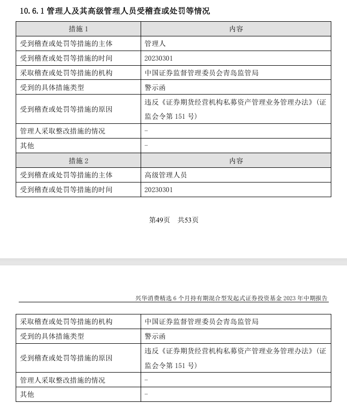 此外,兴华基金此前发布的公告还显示,公司及其相关高级管理人员于2023年3月1日因违反《证券期货经营机构私募资产管理业务管理办法》的规定,收到了中国证监会青岛监管局出具的警示函。