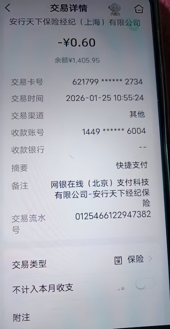 老潘的这笔交易详情显示,交易时间为2026年1月25日上午10时55分,交易渠道标注为“其他”,摘要为“快捷支付”,备注信息为“网银在线(北京)支付快捷有限公司-安行天下经纪保险”,交易类型标注为“保险”。