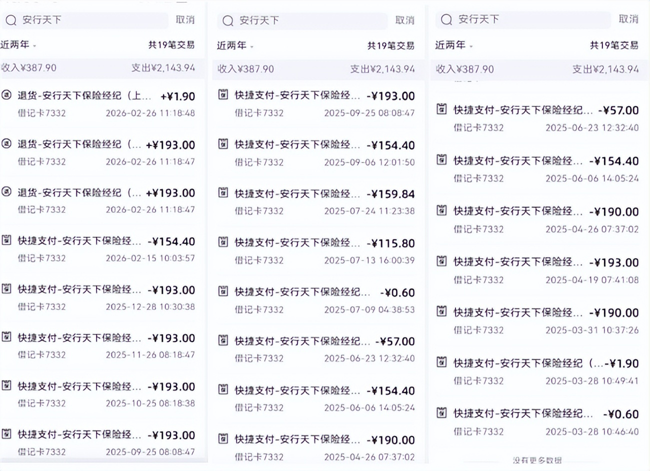 老杨说,投保页面未明确说明该产品为自动扣费、共分十二期缴纳,自第二个月起,每月被扣除保费193元。直至春节期间前往银行领取养老资金查询账户时,才发现名下资金被安行天下保险经纪累计扣除2143.94元。