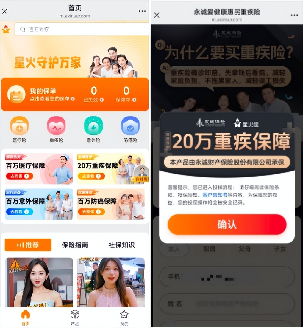 记者在星火保微信小程序首页点击“金牌推荐”标注的“永诚爱健康惠民重疾险”中的“20万重疾保障”保险产品,页面弹出温馨提示,内容为“您已进入投保流程:请仔细阅读保险条款、投保须知、客户告知书等内容,为保障您的权益,您的投保操作将会被安全记录”,下方设置“确认”选项。