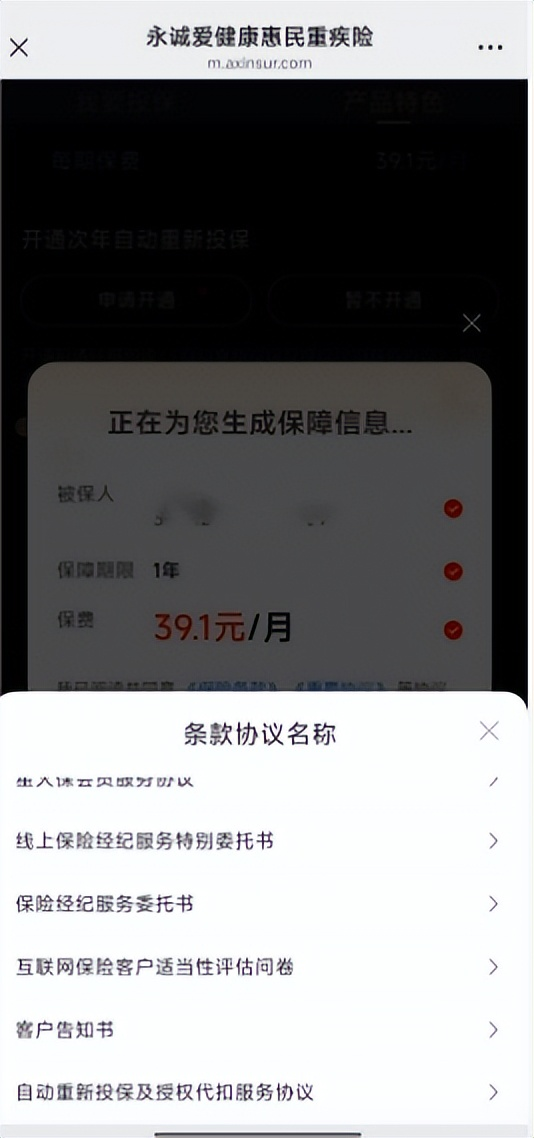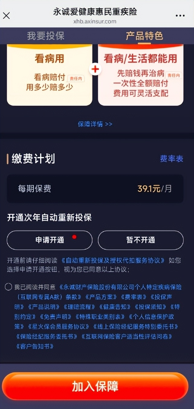 点击确认后进入投保页面,页面显示缴费计划为每期缴费39.1元,同时出现“开通次年自动重新投保”选项,提供“申请开通”与“暂不开通”两个选择按钮,页面提示开通前需仔细阅读《自动重新投保及授权代扣服务协议》,选择申请开通即视为同意该协议。