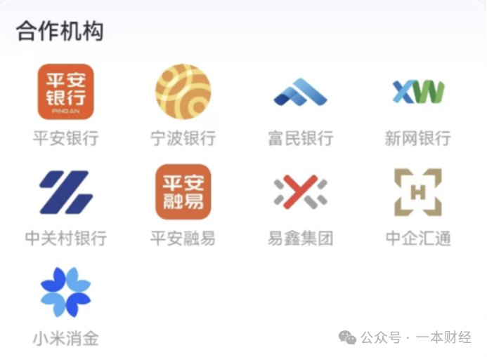 目前,官方公布的合作平台有11家机构,分别是:平安银行、宁波银行、富民银行、新网银行、中关村银行、平安融易、易鑫、中企汇通、小米消金。