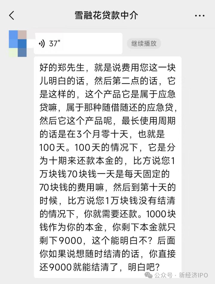 更值得警惕的是其获客与签约模式。该中介明确表示,这款“应急贷”并非全流程线上产品,最终需要借款人线下当面签订合同。从雪融花APP线上提交申请、到贷款中介电话微信联系、再到最终引导至线下当面签约,形成了一条清晰的“线上引流—线下放超利贷”链条。这种安排将最易留痕、最便于监管抓取的交易环节搬至线下,既增加了借款人的举证难度,也为平台日后撇清关系预留了空间。