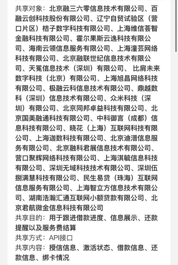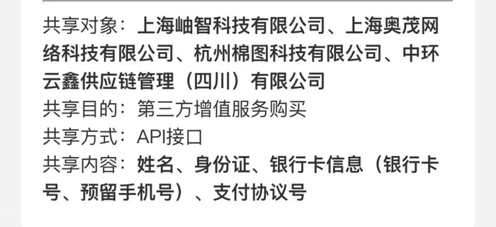 易花花平台的第三方共享信息说明显示,信息共享目的为第三方增值服务购买的企业有四家,除了上述三家企业外,上海岫智科技有限公司(本文称“岫智科技”)也在信息共享名单内,公开信息显示,岫智科技为知名权益服务商上海及未科技有限公司的孙公司。