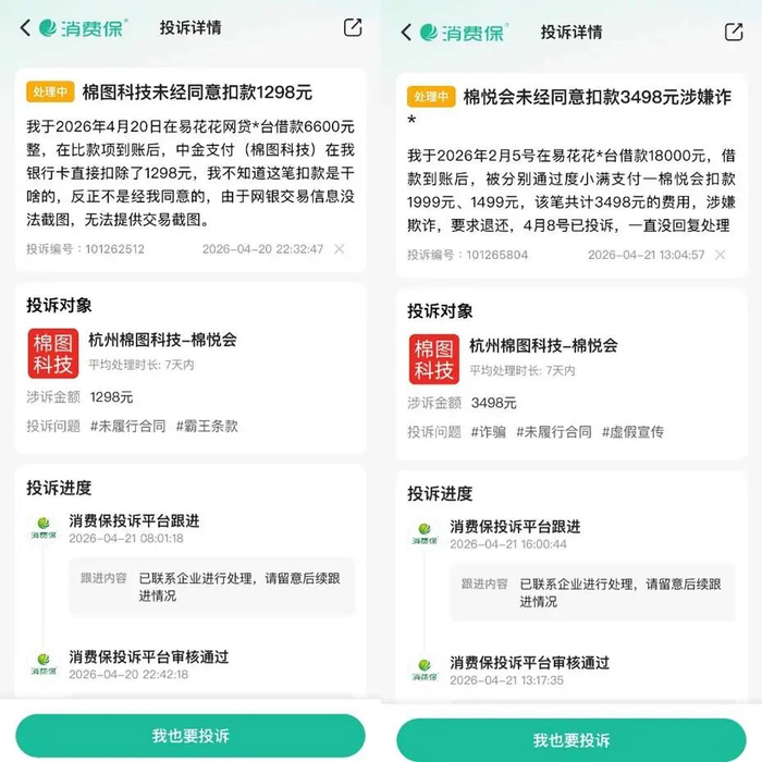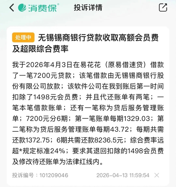 消费保投诉平台中,一名消费者投诉称,2026年4月3日,在易花花平台借款7200元,由无锡锡商银行放款,分6期还款。但在借款到账后,消费者提到该公司立即扣除了其1498元的会员费。