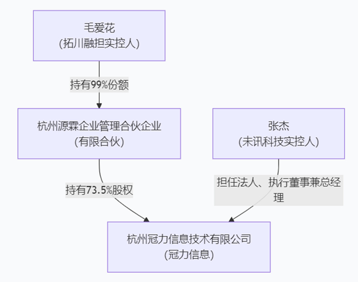天眼查显示,经股权穿透后,拓川融担的实控人毛爱花通过旗下有限合伙企业杭州源霖企业管理合伙企业(有限合伙),持有杭州冠力信息技术有限公司(本文称“冠力信息”)73.5%的股权,而未讯科技的实控人张杰目前担任冠力信息的法人、执行董事兼总经理。