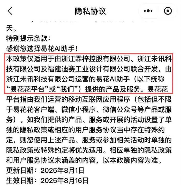 易花花小程序显示,其平台认证主体为福建拓川融资担保有限公司(本文称“拓川融担”)。平台内的隐私协议显示,该平台由浙江霖梓科技控股有限公司(本文称“霖梓控股”)、浙江未讯科技有限公司(本文称“未讯科技”)、福建迪赛工业设计有限公司(本文称“迪赛设计”)联合开发,未讯科技提供运营。