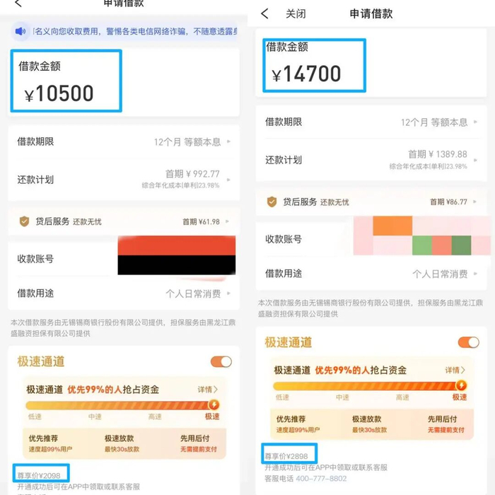 此外,据了解,消费者被平台扣取的费用不尽相同,金额越高的借款,收取费用越高。另一名用户分享的截图显示,借款14700元,“极速通道”的价格为2898元。