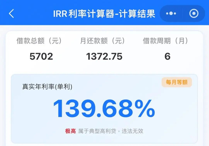 新黄河记者使用IRR利率计算器测算,该笔借款的真实年利率高达139.68%,远超利率监管红线。